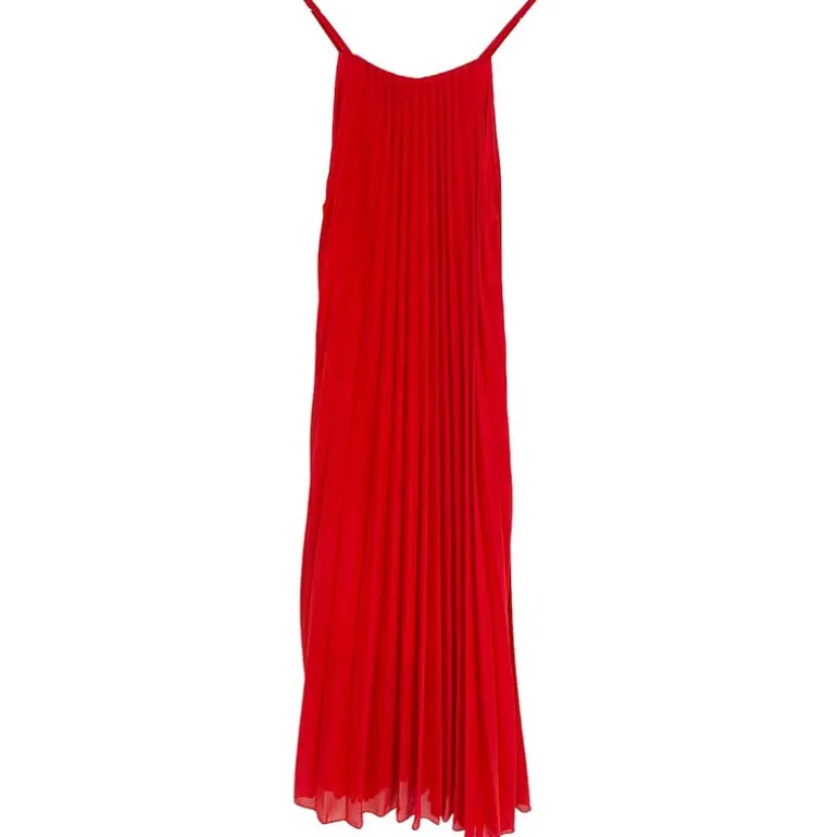 Smuk lang plisse festkjole i rød.